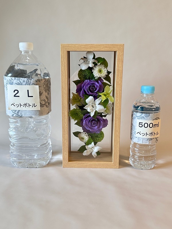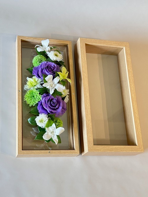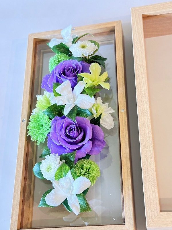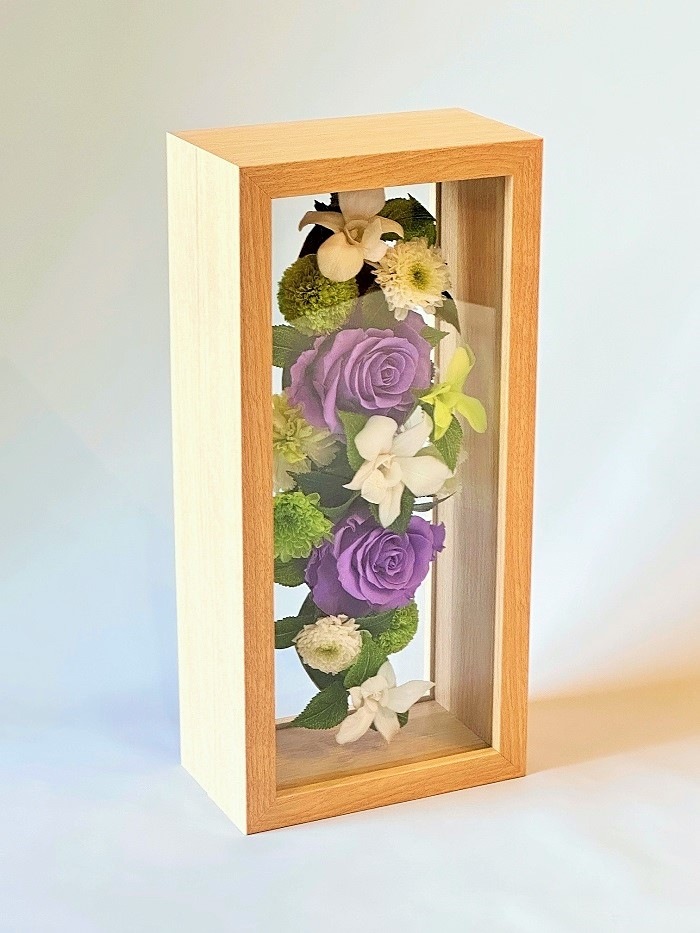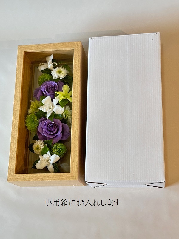 プリザーブドフラワーお供え花 ウッドフレーム大(ベージュ) 紫バラ(高さ30cm)