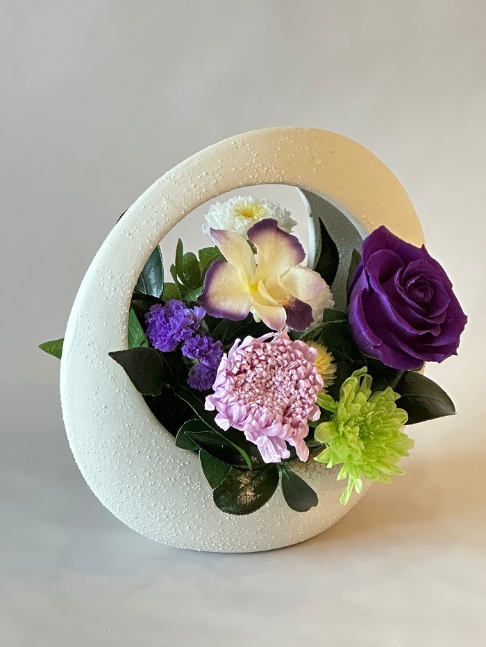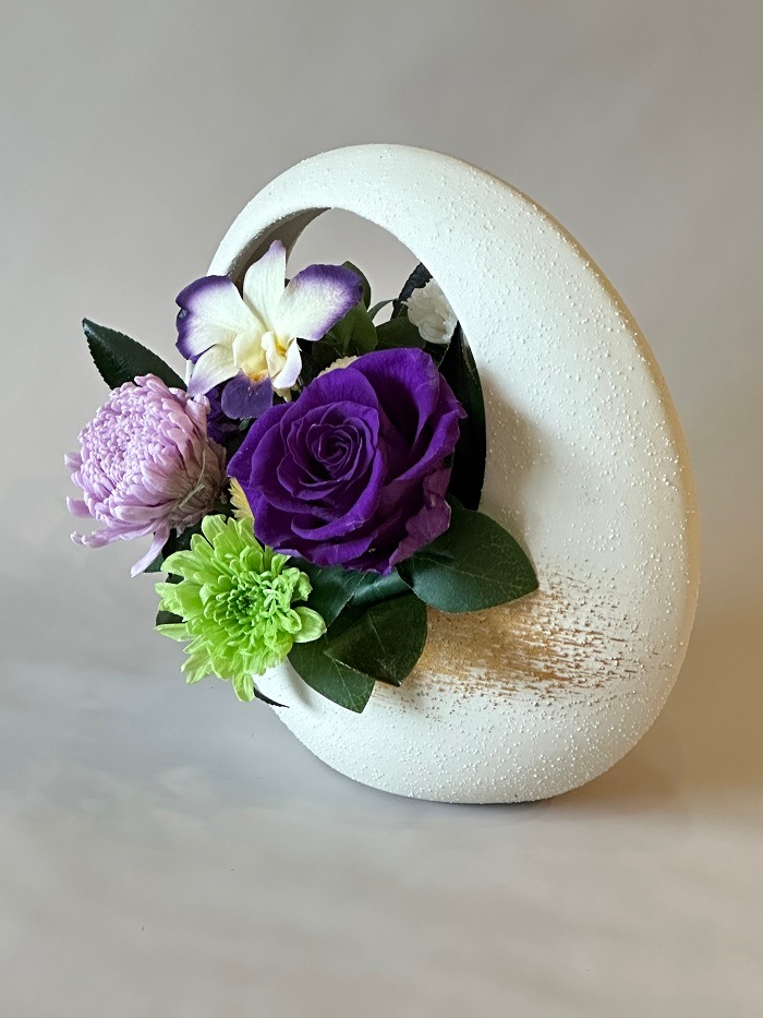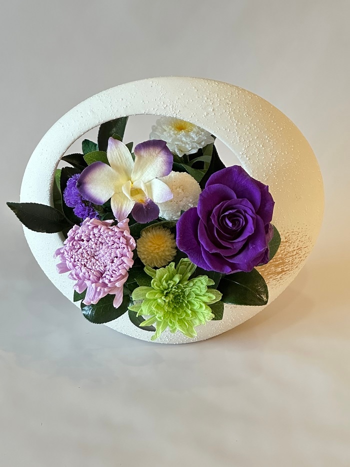 紫のプリザーブドローズ、花びらに紫色のふちどりがあるデンファレ、数種の菊などをアレンジし、豪華に仕上げました。