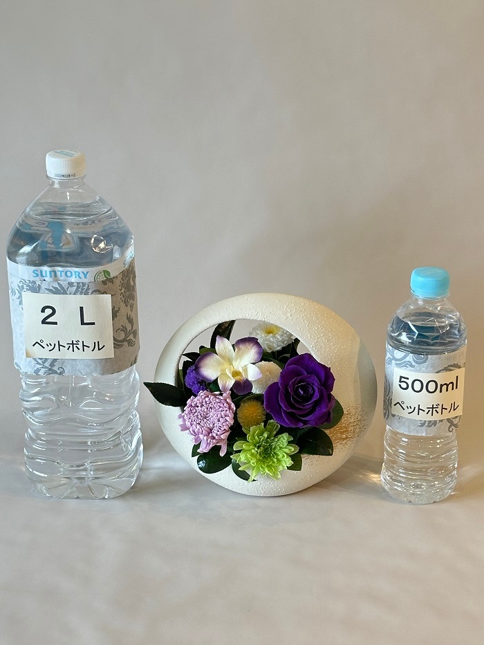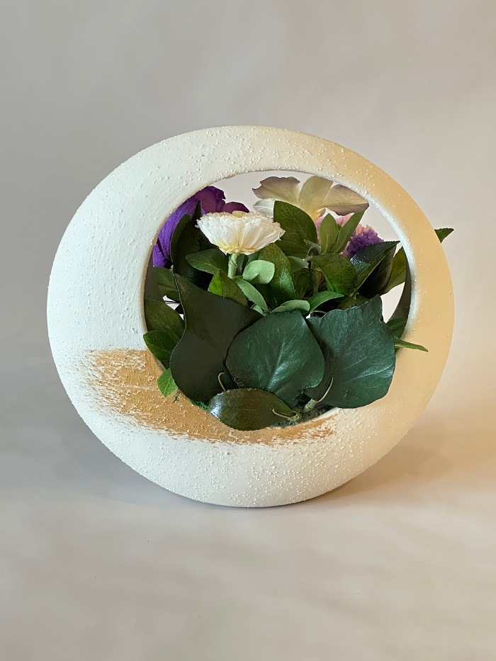 花器の色味の状態により、円形の幅広の部分が逆向きになることがあります。その場合花の配置は少し変化します。