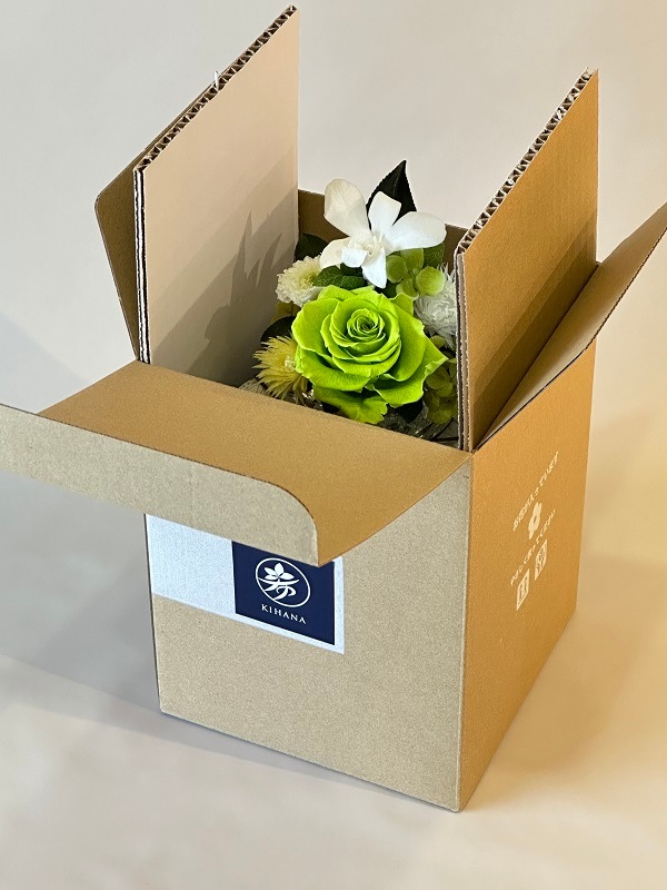 但しプリザーブドフラワーは着色を施している為、濃い色が薄い色へ色移りします。これを防止する為、花や葉の根元にのみ目立たないよう、あえてアーティフィシャルフラワー(造花の葉や花)を使用しています。