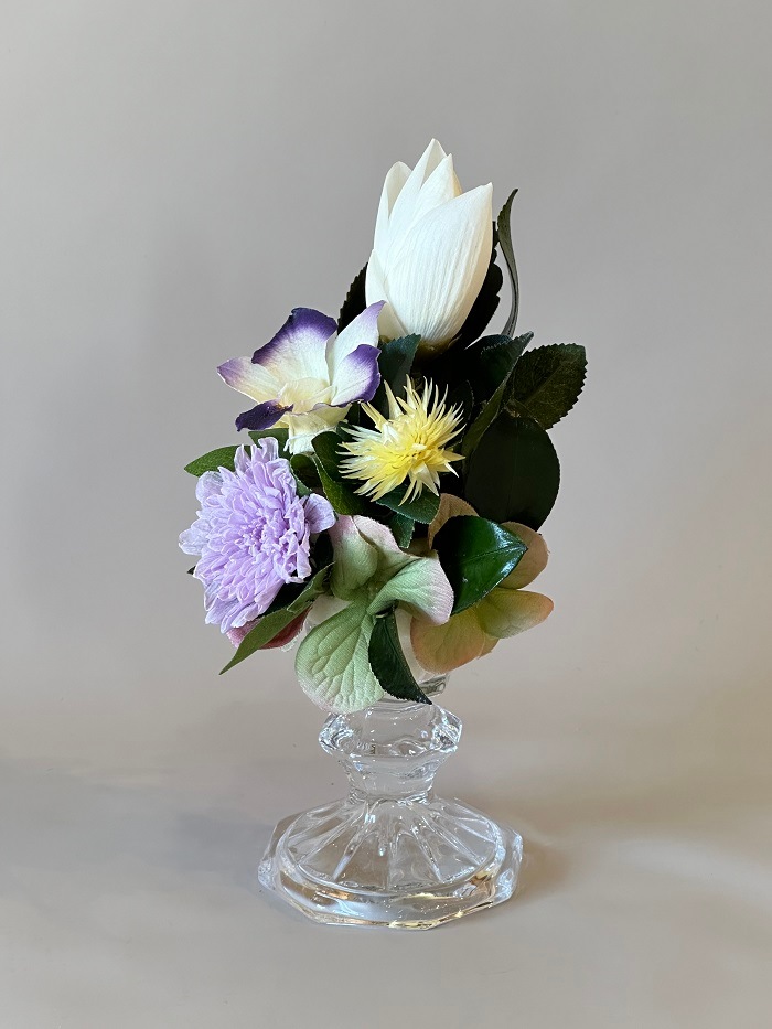 ガラススタンドに蓮や蘭を取り合せたモダン仏花です。