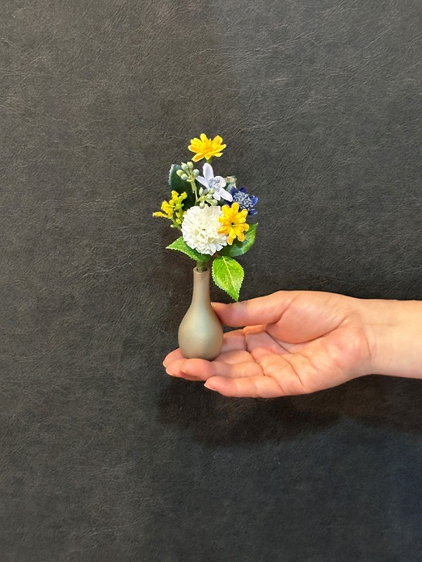 アーティフィシャルフラワー(造花)の小花を集め、小さな花器に飾りました。