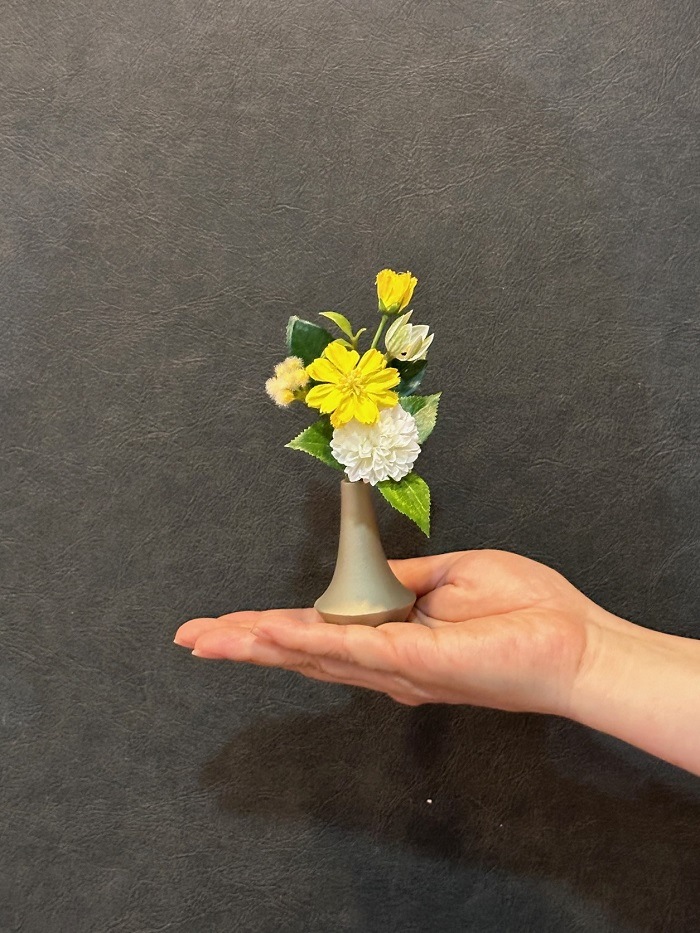 アーティフィシャルフラワー(造花)の小花を集め、小さな花器に飾りました。