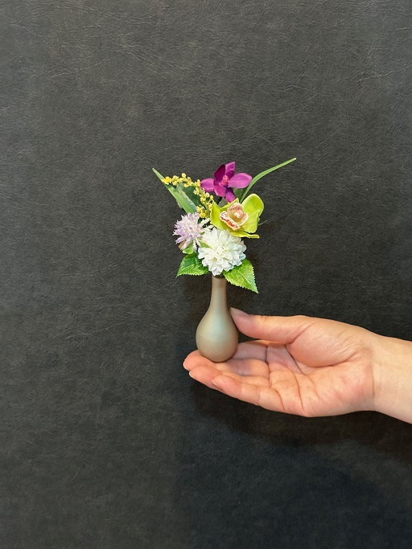 アーティフィシャルフラワー(造花)の小花を集め、小さな花器に飾りました。