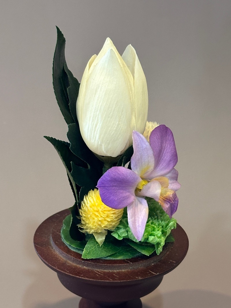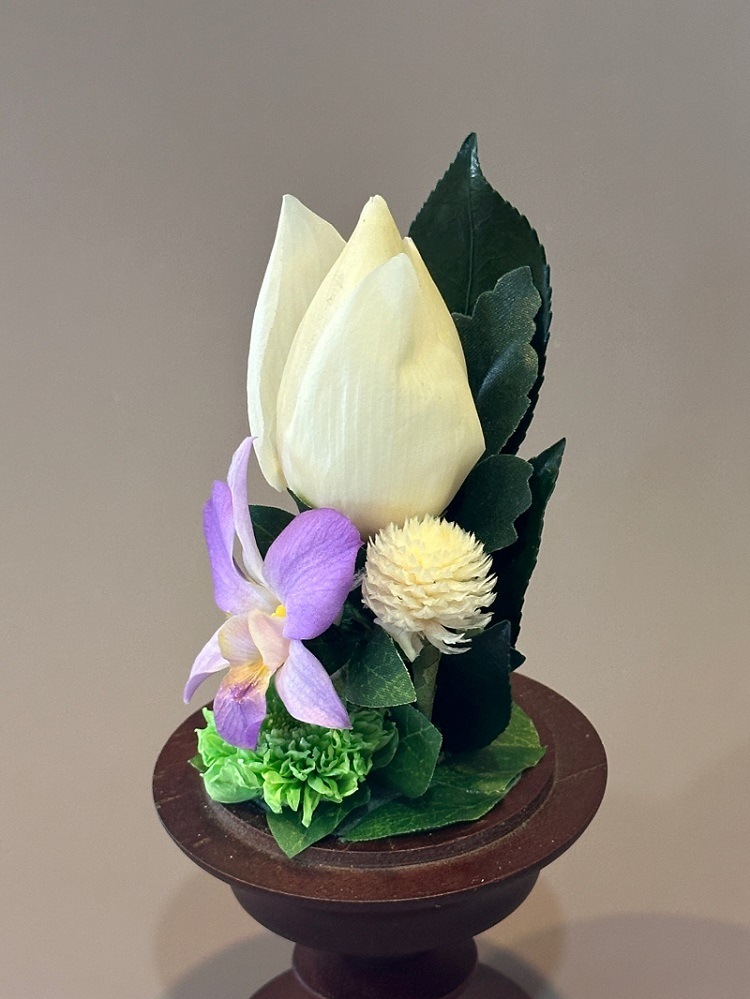 プリザーブドフラワーでは珍しい蓮を使用した仏花です。蘭と取り合わせ可愛らしく仕上げました。