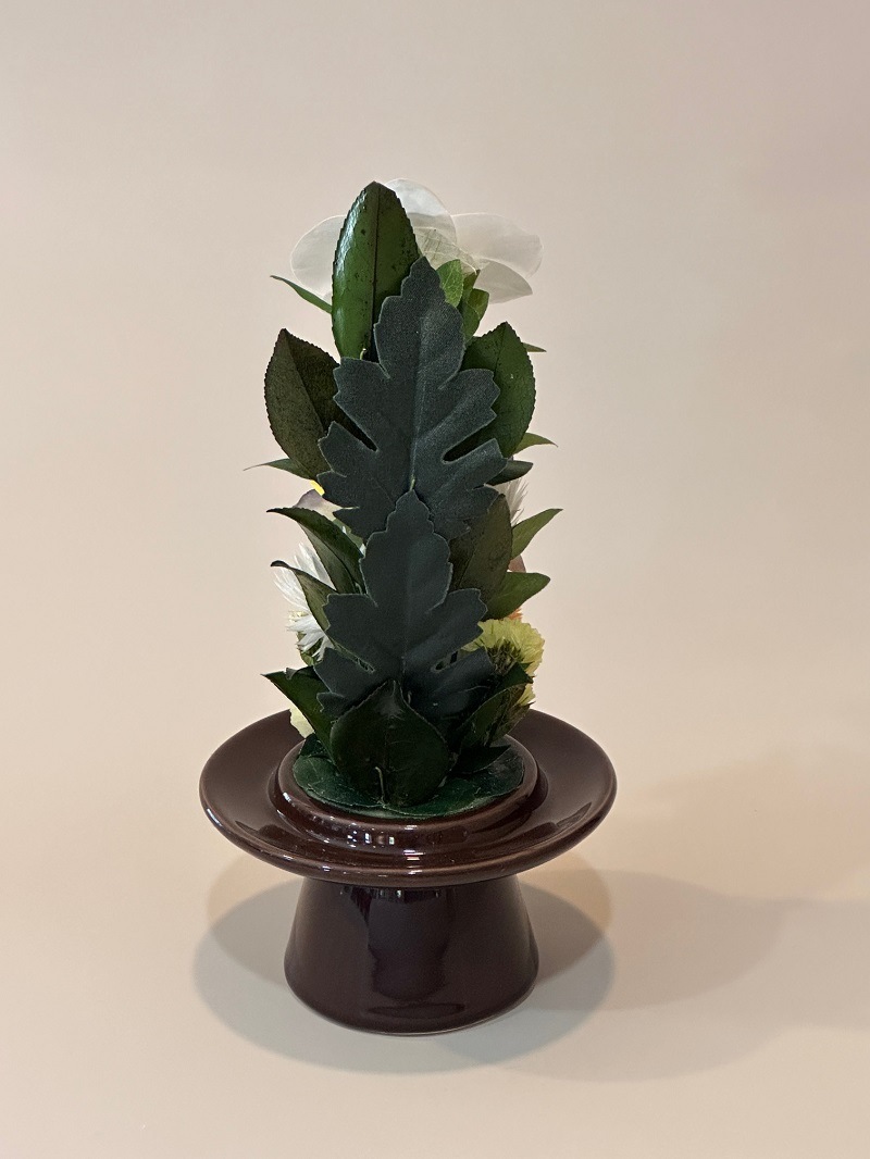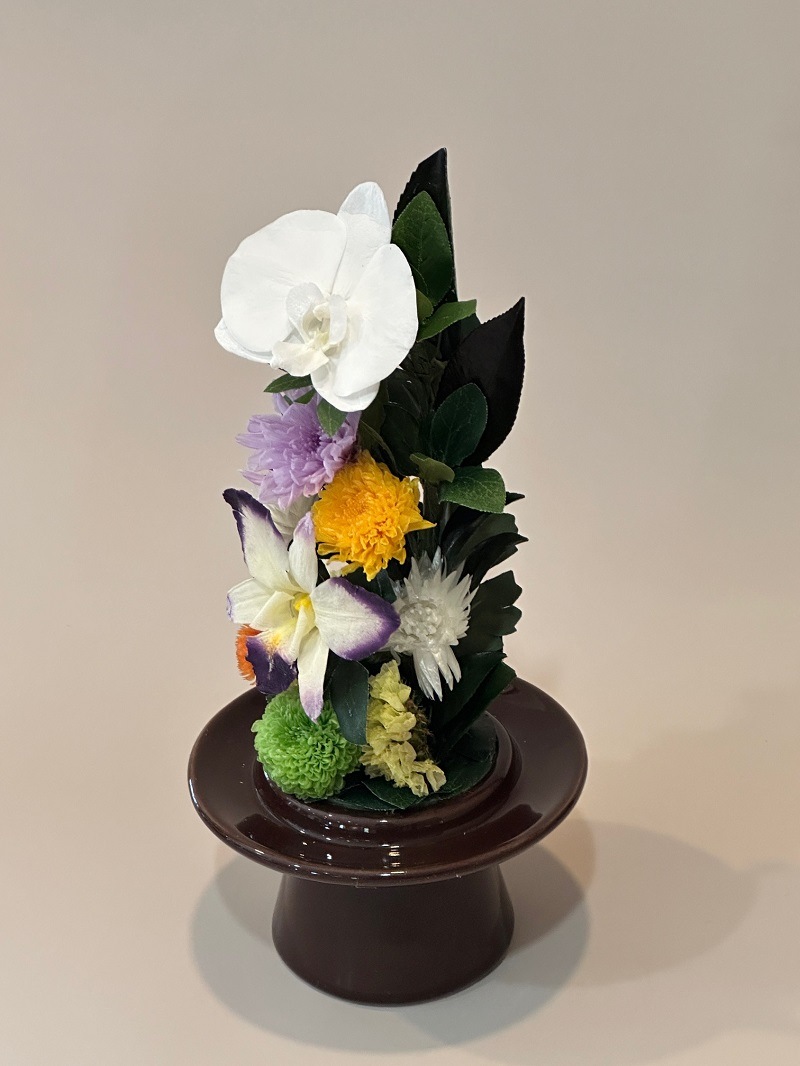 プリザーブドフラワーの胡蝶蘭、蘭、数種の小菊などを取り合せ、彩り豊かに仕上げた仏花です。