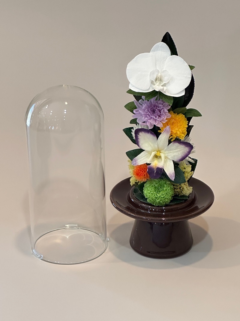 プリザーブドフラワー仏花 ガラスドーム大 胡蝶蘭ことね菊 (全高27cm)