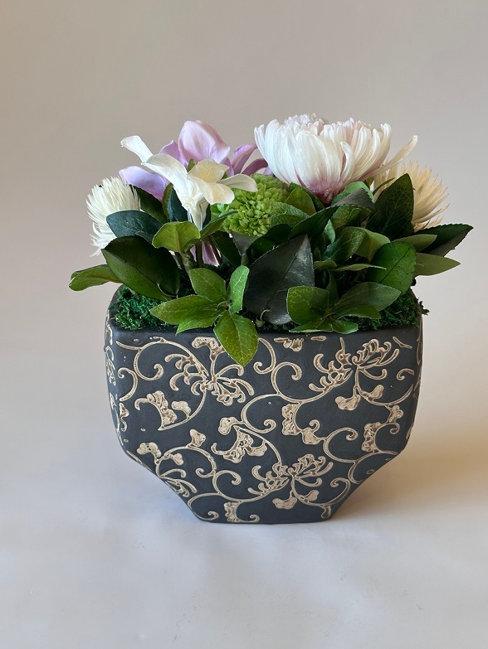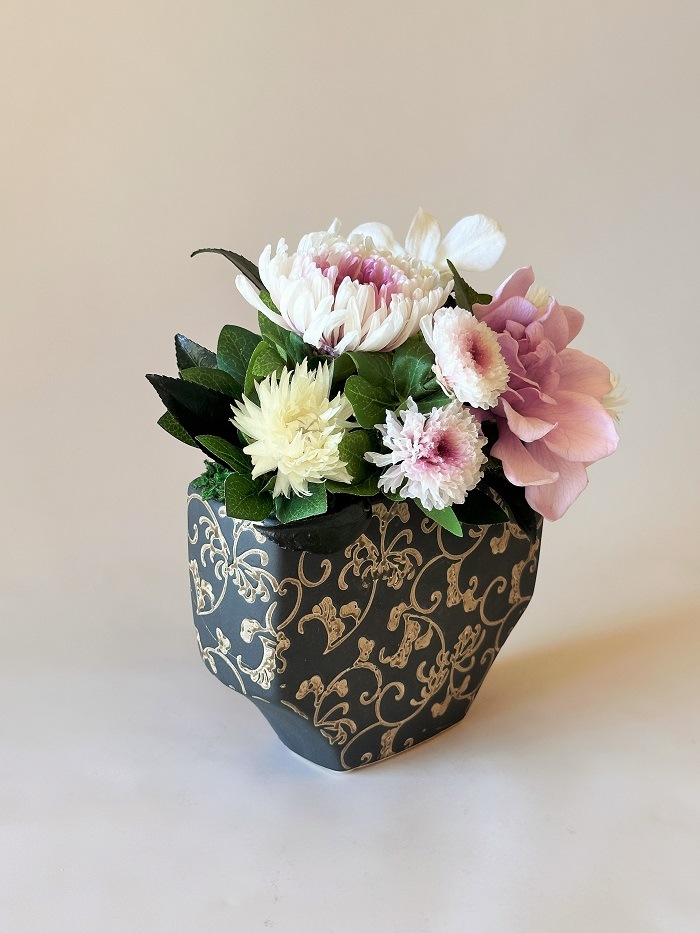 こちらは和モダンの花器を使用しており、和の空間にも洋風の空間にもよく合います。