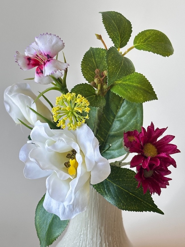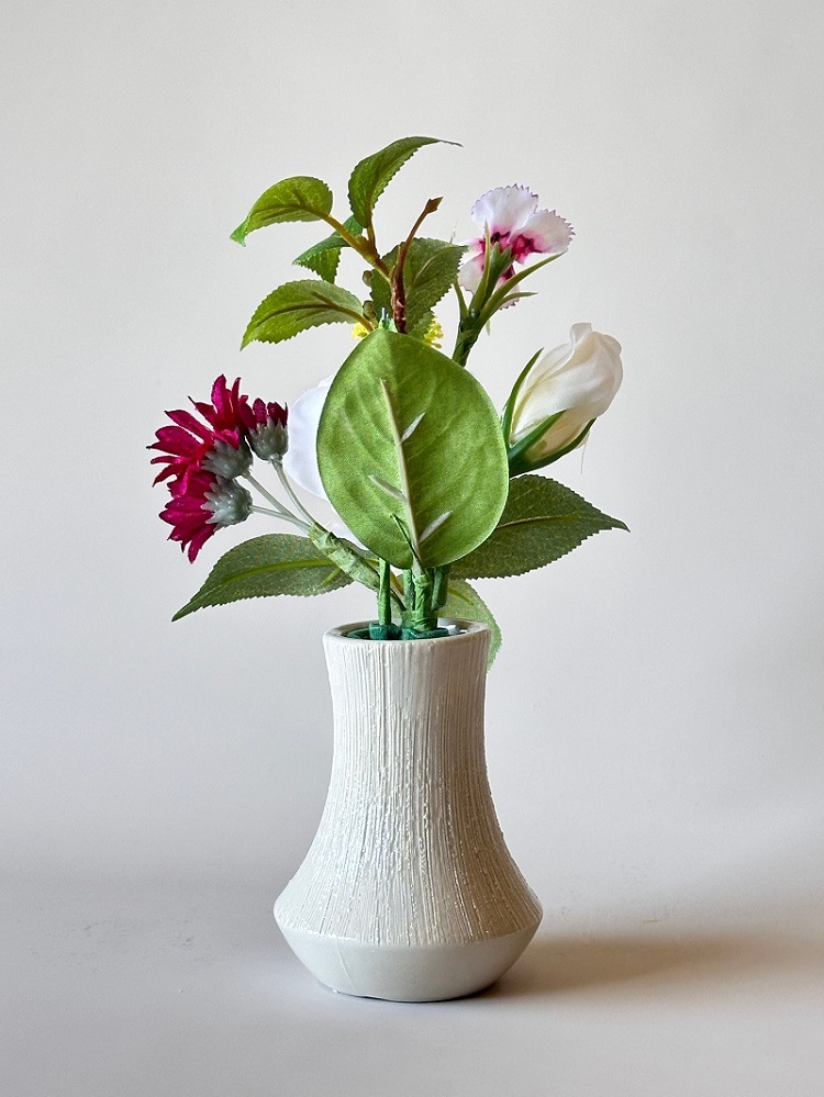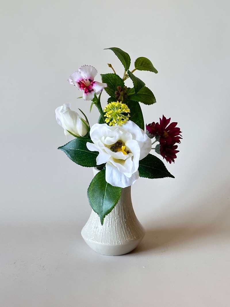 アーティフィシャルフラワー(造花)を使用した小ぶりな仏花です。モダンな家具調仏壇や写真立ての脇に飾る仏花としておすすめです。