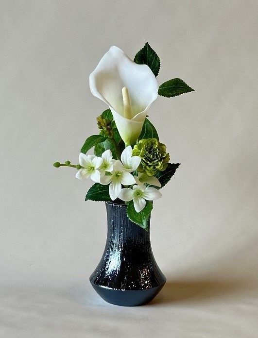 アーティフィシャルフラワー(造花)のカラー、ピンポンマムなどを使用した小ぶりな仏花です。モダンな家具調仏壇や写真立ての脇に飾る仏花としておすすめです。